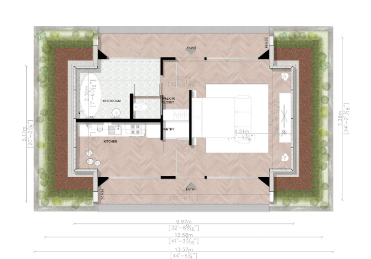 親しい方との滞在や少人数でのご利用に最適な「エコヴィラ SINGLE」は、広々としたベッドルーム、設備の整ったバスルーム、そして基本的な料理に対応するコンパクトなキッチンを備えています。環境に優しい素材で建てられたこのヴィラは、長期滞在でも快適さを保ちながら、運用コストを抑える設計です。