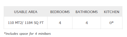 家族や友人との滞在にぴったりの「クワッドエコヴィラ」は、4つのベッドルームと4つの専用バスルームを備え、プライバシーと快適さの両方を確保しています。簡易キッチンでは、室内での食事の準備も可能で、長期滞在にも最適です。