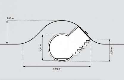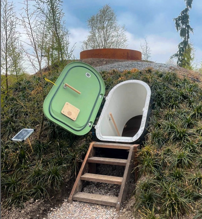 - 景観との調和:見た目 はまるでイグルーのような球体型で、入 口 から階段を降りて貯蔵庫に行 く構造。扉以外はすべて地下に埋まっているため、外から見 えるのは扉のみで景観を損なうことがありません。