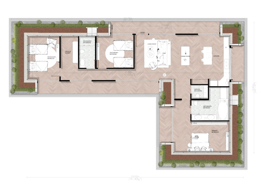 専用バスルーム付きの主寝室に加え、2つのセカンダリーベッドルームには共用バスルームを完備。さらにサービスバスルームも備え、家族みんなが快適に過ごせる設計となっています。
