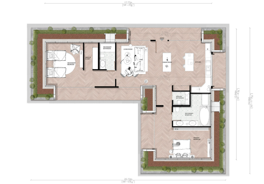 この2ベッドルームユニットは、小さなご家族やカップルに最適な、モダンで快適な住空間を提供します。主寝室とセカンダリーベッドルームには、それぞれ専用バスルームとクローゼットを完備し、プライベートな時間も心地よくお過ごしいただけます。また、ユニット是㎜タイは持続可能性を重視して設計され、自然光を最大限に取り入れるプランニングや、エネルギー効率の高いシステム、環境に配慮した素材を採用しています。
